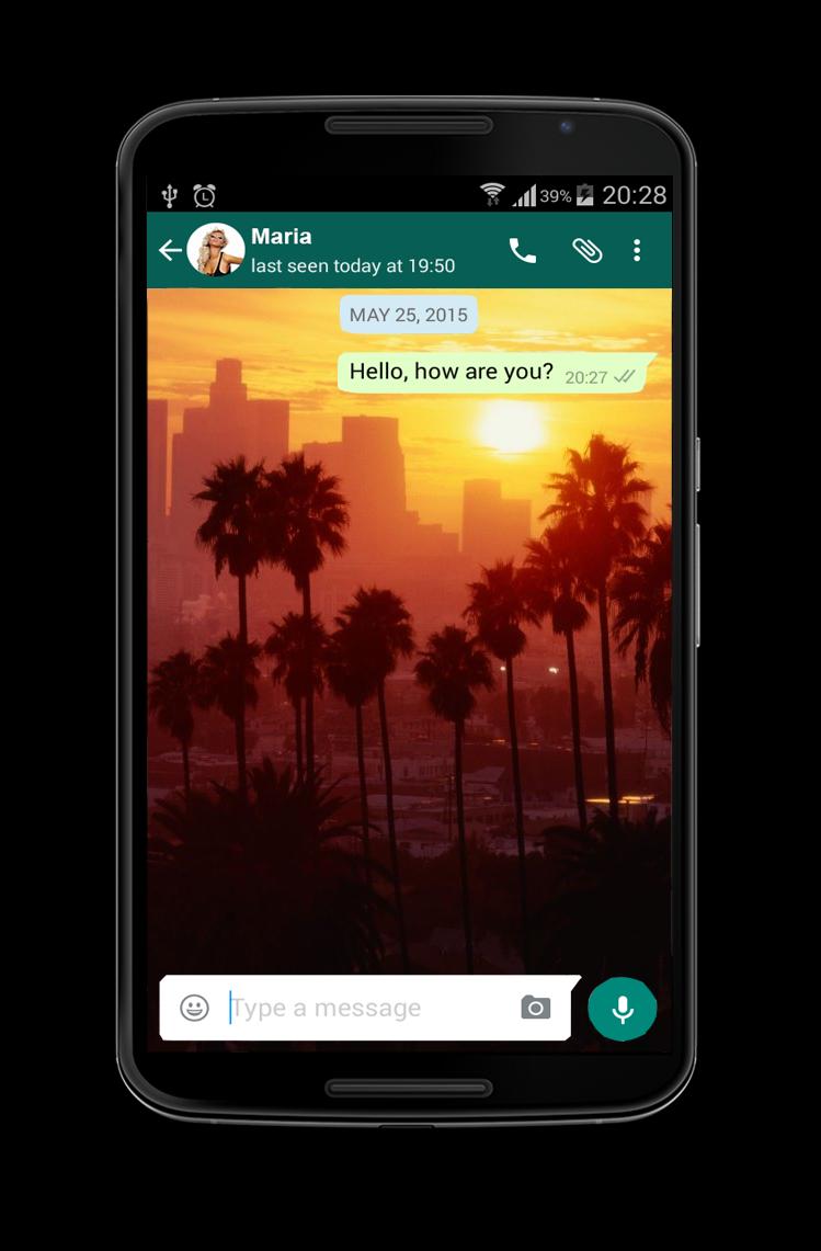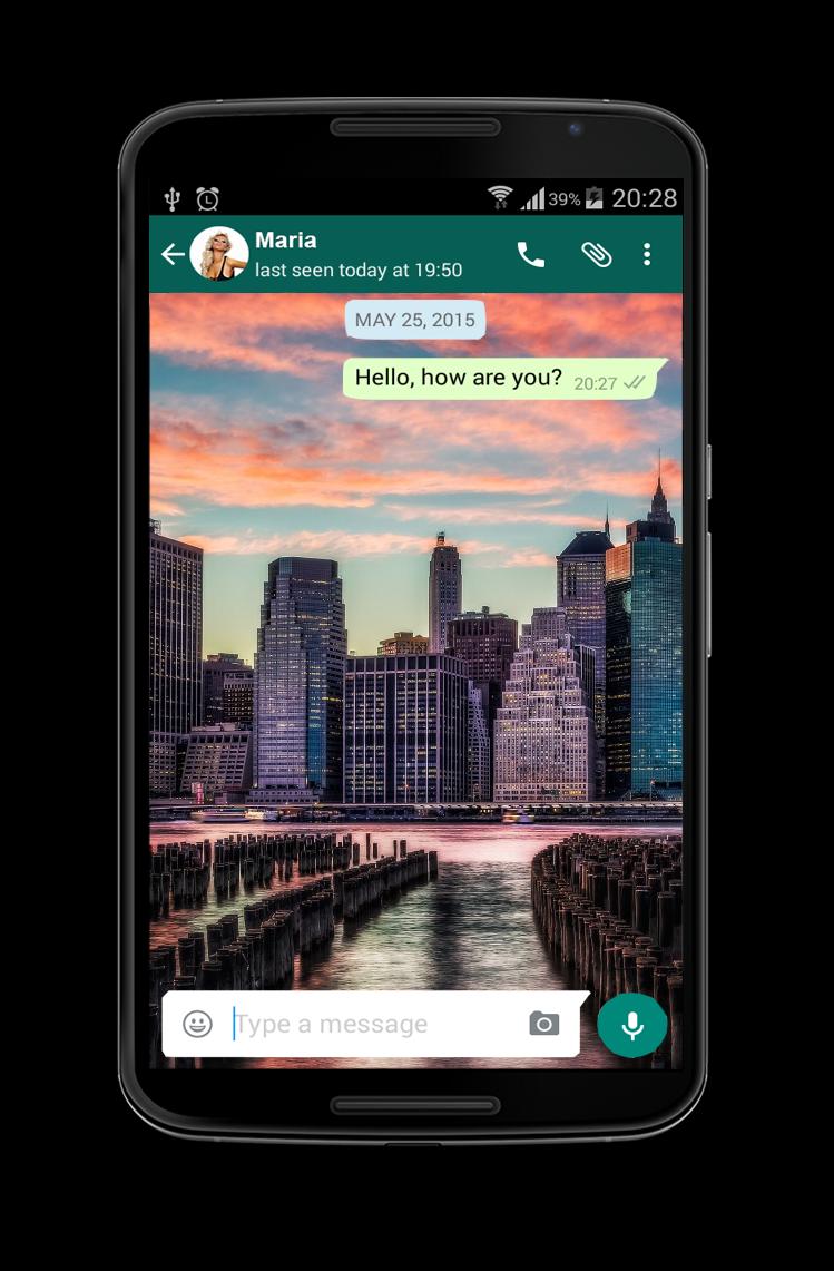 打開your-whatsapp Messenger。單擊菜單按鈕。選擇設置 - >聊天設置 - >牆紙。選擇此應用程序,並使用中間的按鈕設置您的最愛圖片。